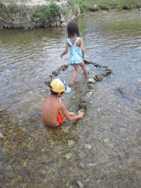 子供達は、川の中に魚を捕まえる囲いを石で建設(笑)