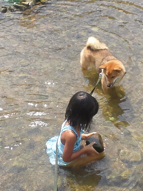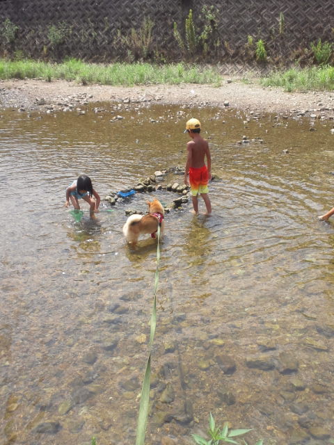 子供達すっかり日に焼けてますね!!お兄ちゃんの色の黒さにびっくりして、二度見しちゃいました。健康的です。やっぱり日本の日差しは違うなぁ。。。魚を狩るさくらちゃん、柴犬的!アスカとセナにも獲物は水の中にもいるんだよーと言っておきます。
