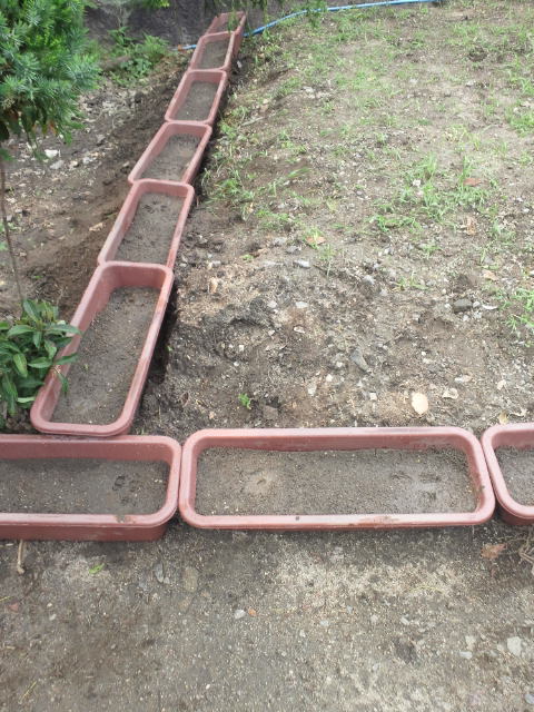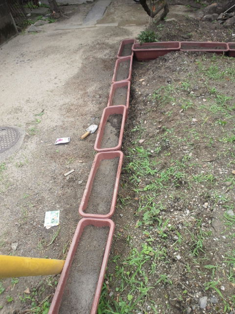ブロックの足りなかった所に土止め代わりにプランターを並べました!