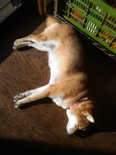 寒くなると、暖かい場所を見つける柴犬さくら。