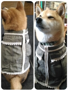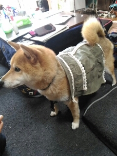 さて、このエプロンポーチ、柴犬さくらに着せて見ると…