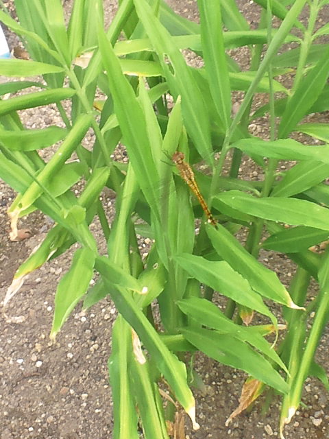 秋あかね(赤トンボ)は、生姜の葉にも留まります。