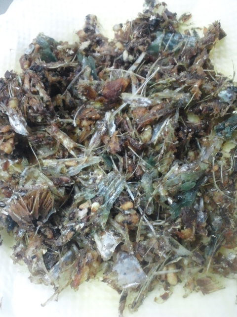 ②炒めながら、頭をほぐして、大きな骨は小さくします。