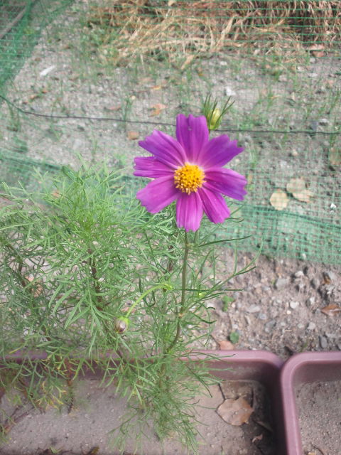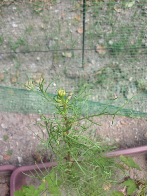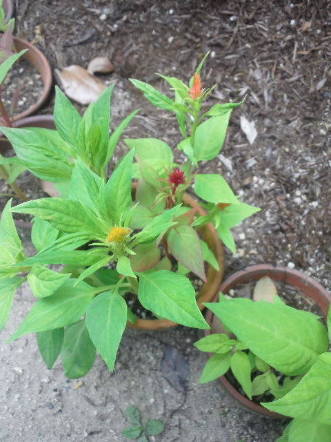 花壇の周りに埋めた鉢にマリーゴールドを蒔いたのに上手く発芽しなかった場所にケイトウを蒔いておいたのです!