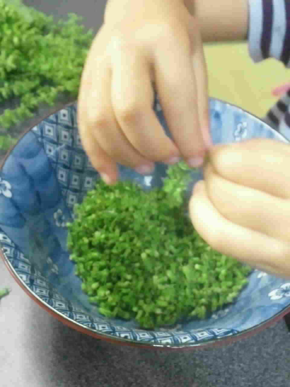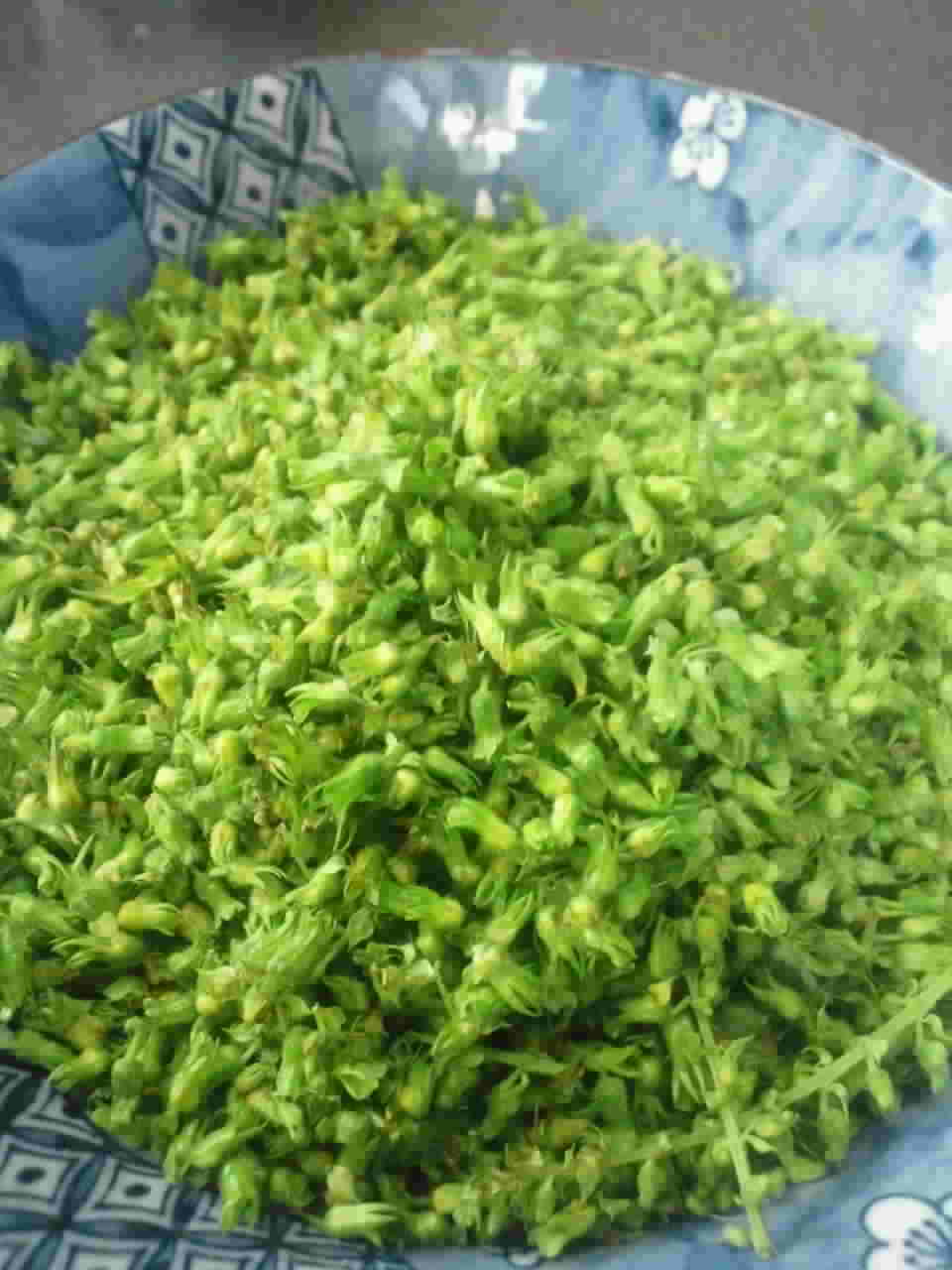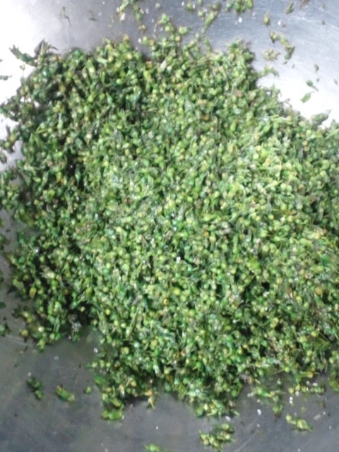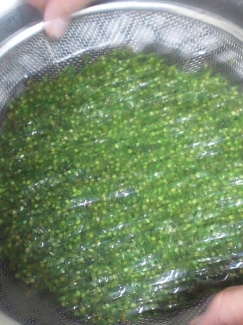 手で取り外した紫蘇の実を塩で、よく揉みます。