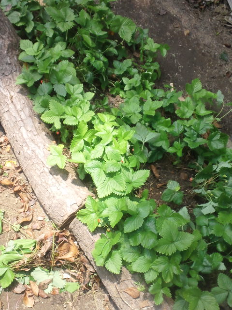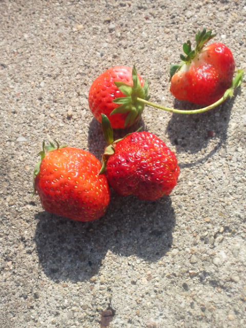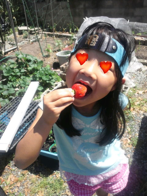 娘ちゃん、息子ちゃん、友達とお庭で苺狩りって、いいですね♪