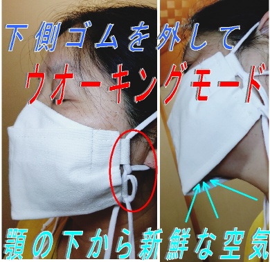 マスクゴムを上下に分ける事で、マスクの下部を開くようにしました。