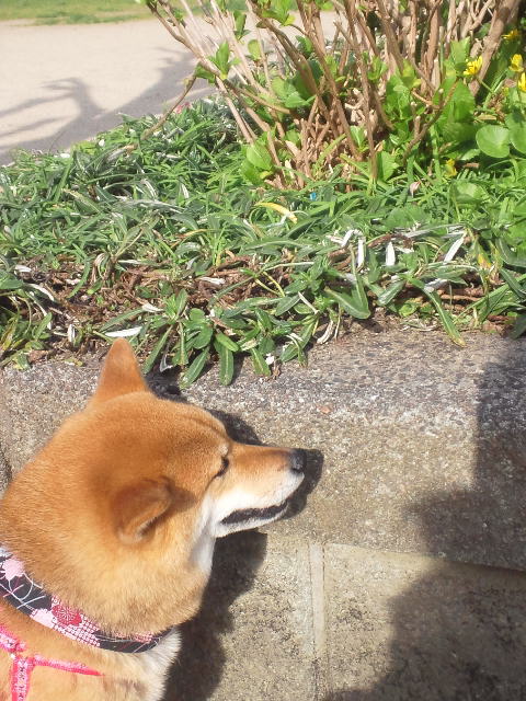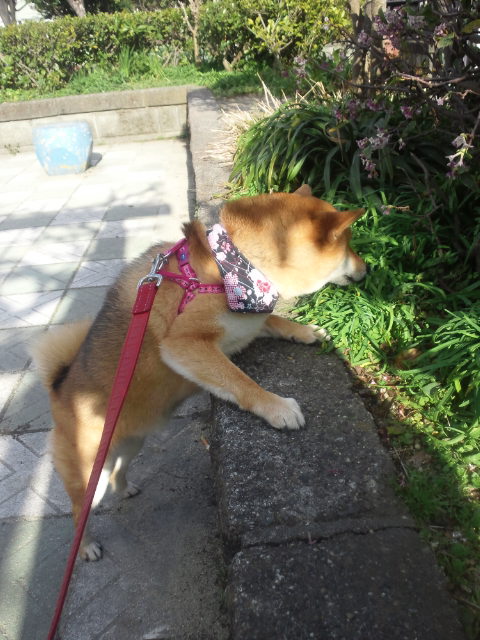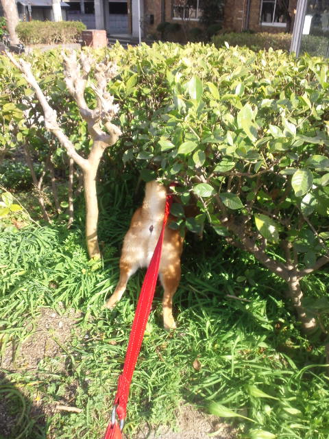植え込みに顔を突っ込んでいる、さくらちゃんは、誰と出会っているのでしょうね。