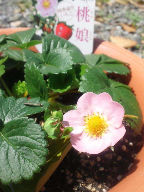 先日、娘が植えたイチゴの「桃娘」も咲き始めています。