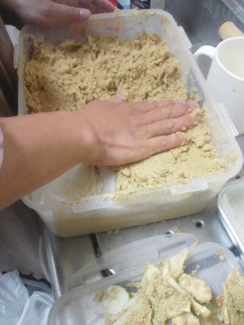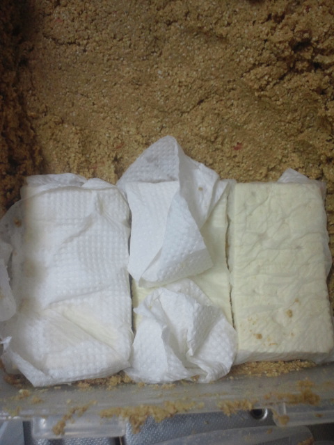 水を切った豆腐をキッチンペーパーかガーゼに包んで糠床に並べます。