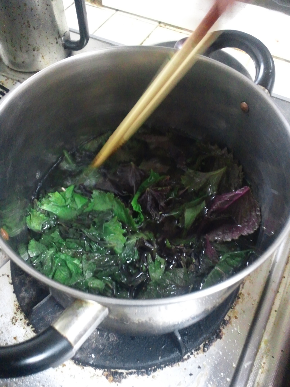 大きめの鍋に赤シソの葉を入れて、ひたひた位の水で煮出します。