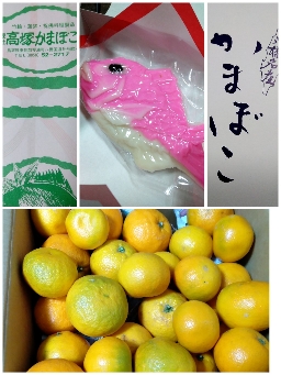 いつもブログでお世話になっている「ミミパパとの愉快な日常生活」のミミちゃん所から、大量の伊予柑と、最近では珍しい鯛がかたどられた蒲鉾です。