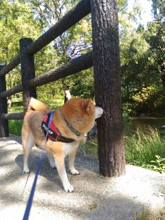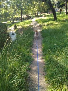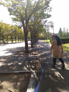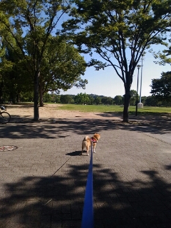 ロングリードいっぱい伸ばしてウキウキな柴犬さくら。