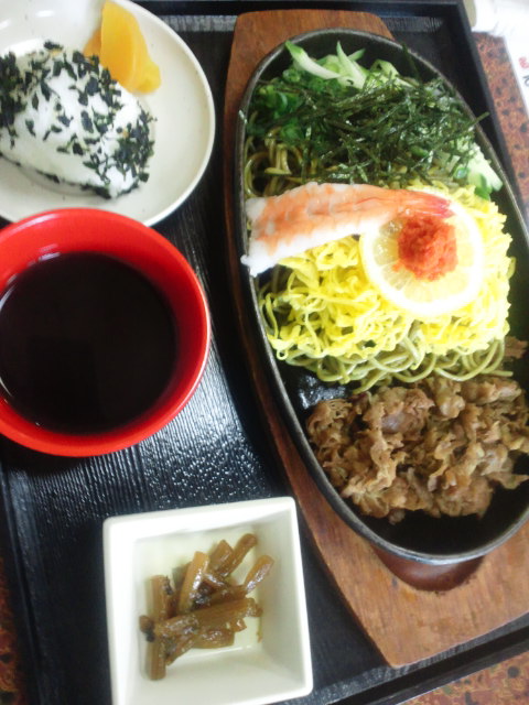 熱い鉄板の上に乗った茶そばを、つけ麺形式で頂きました。