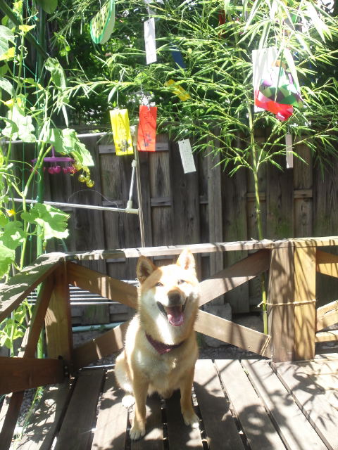 ザワザワする七夕飾りが、気になる柴犬さくら。