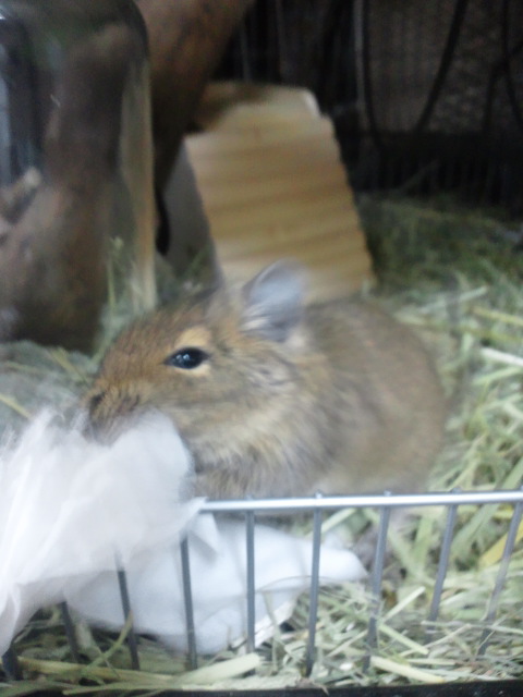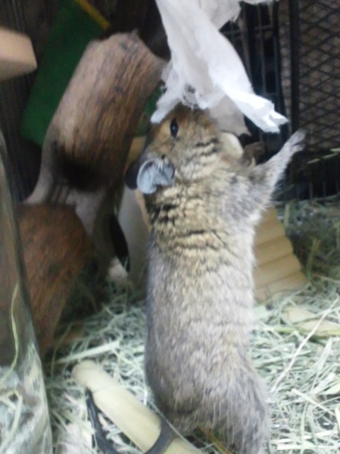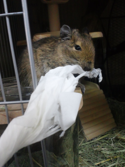 グイグイ引っ張って、ティッシュを引き裂くデグーもみじ。