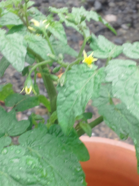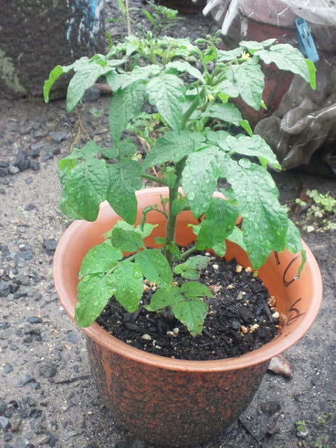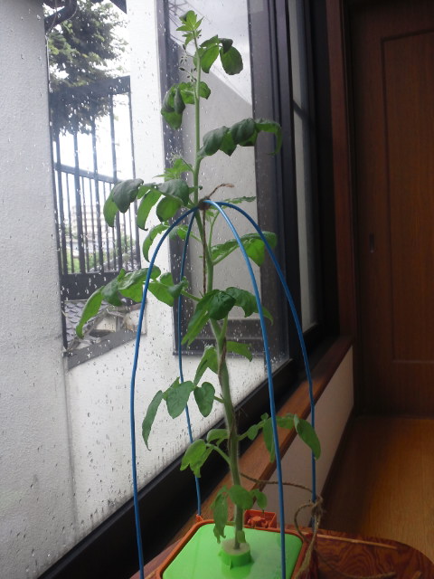 鉢に植え替えた、こどもチャレンジのトマトは、背丈も落ち着き、順調に脇芽も増えてます。