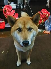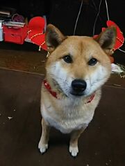 トナカイの角を付けられて、ドンヨリ顔の柴犬さくら。