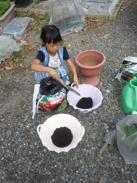 植木鉢に土を入れて、苗を植え付けました。