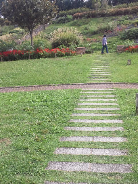 道を渡る橋に向かう階段には綺麗な花が咲いています。