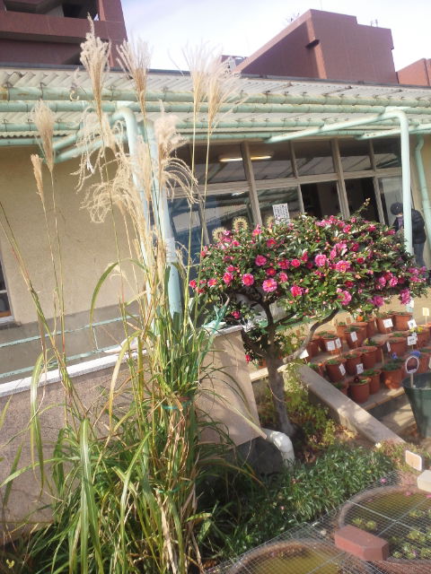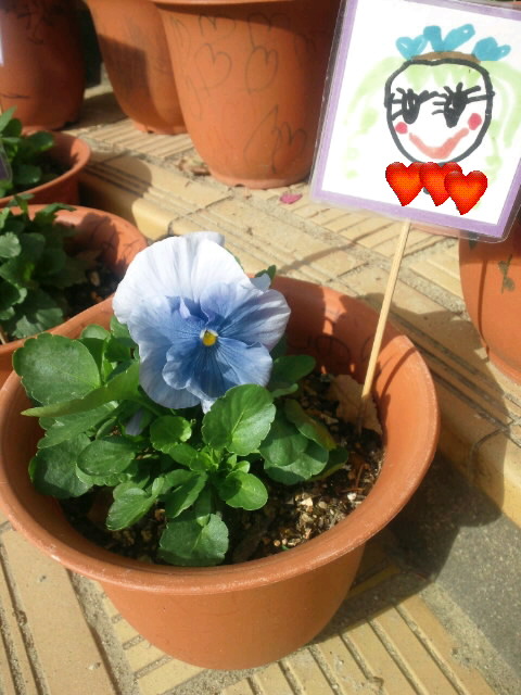 幼稚園で育ててるパンジーが、寒さの中元気に咲いてました。