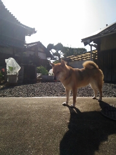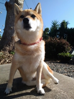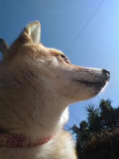 秋晴れの朝、爽やかな空をバックにすまし顔。