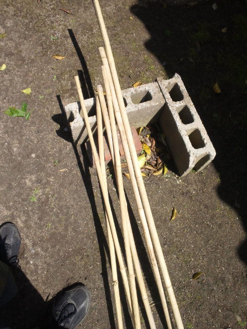 適当な長さに切って、適当に組み合わせ、麻縄でくくって、竹馬らしいものを作ってみましたが…