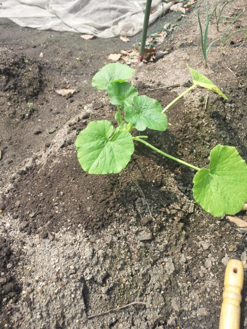 ツルが伸びてもいいように、畑のはしっこの畝に植え付けます。