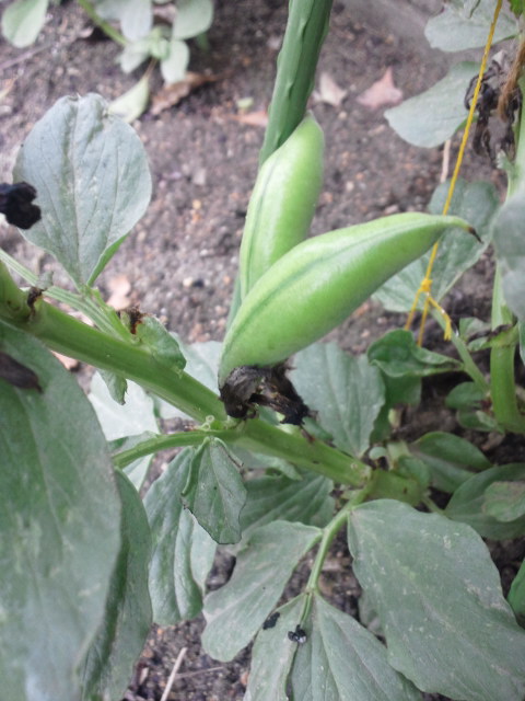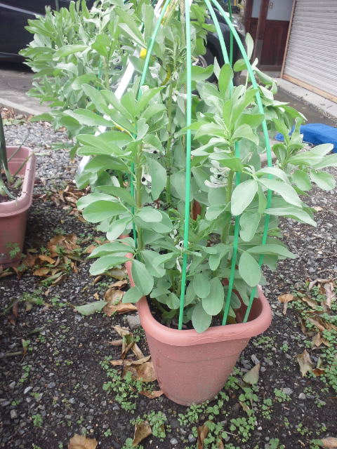 大きく育ったそら豆のプランターが今日の強風でコケました。