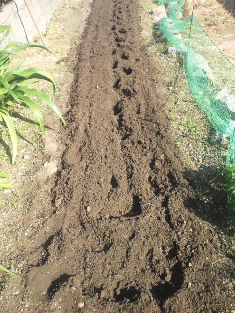 先日、石灰窒素を鍬込んでおいた場所に、堆肥と牛糞を鍬込みました。