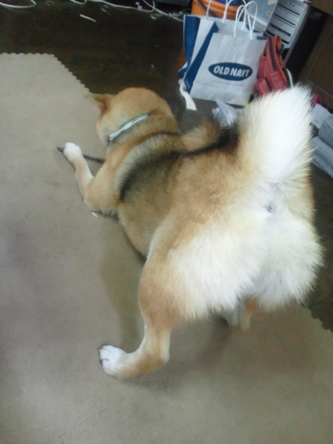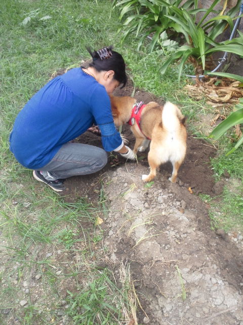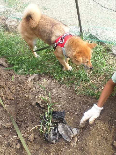 芋掘りしてた時に出てきた、ミミズみたいに細いサツマイモを、柴犬さくらに進呈。
