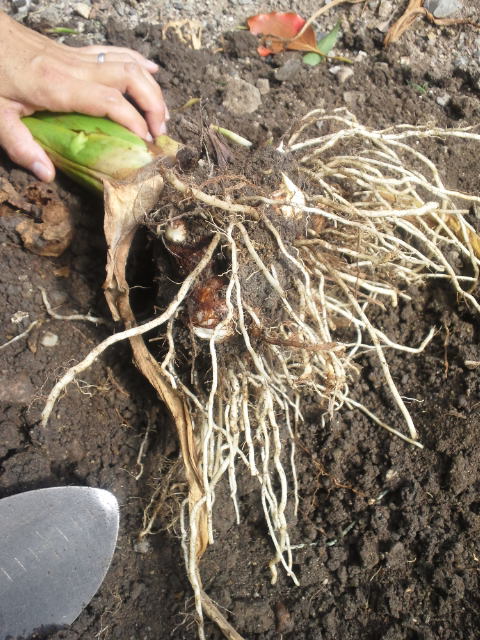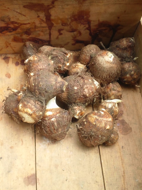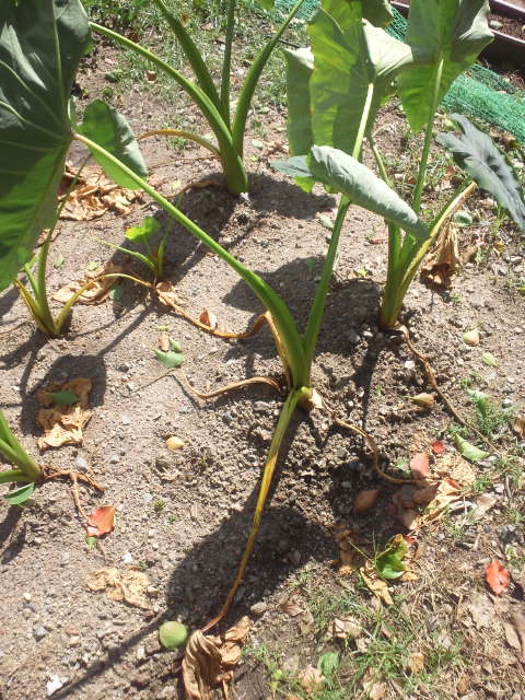 サトイモの葉が悪くなって来たので、試し掘りをしました。