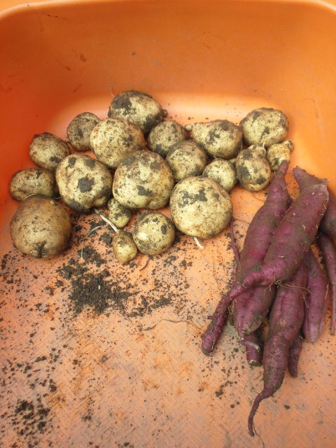 ジャガイモ3株とサツマイモ2株で、こんな収穫。
