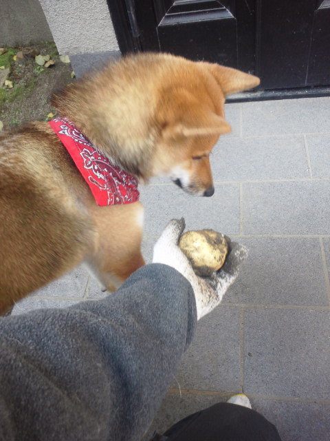 家に持って入ろうとすると、庭で遊んでいた柴犬さくらが興味深々…