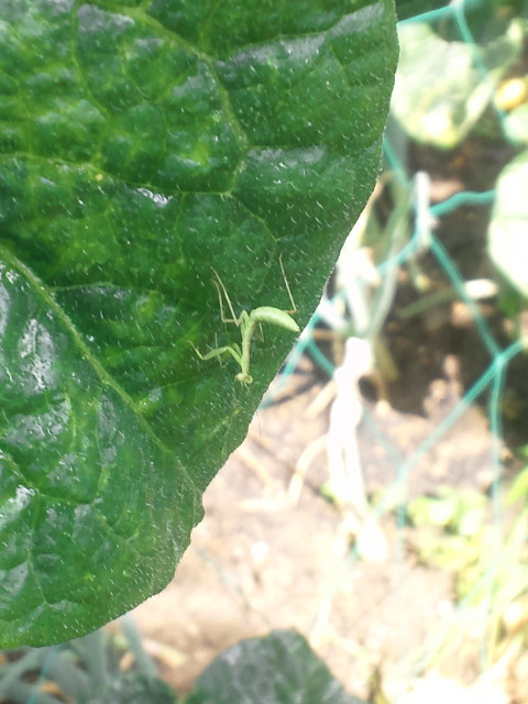 キュウリを収穫してるとき、ヤングカマキリに出会いました。