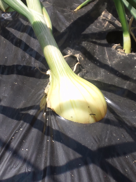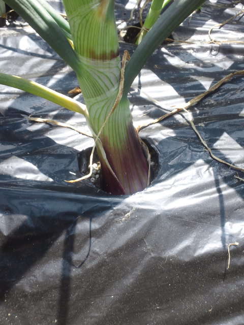 秋に植え付けたひょろひょろの玉ねぎ苗が、寒い冬を乗り越えて、ネギから玉ねぎに成長中。
