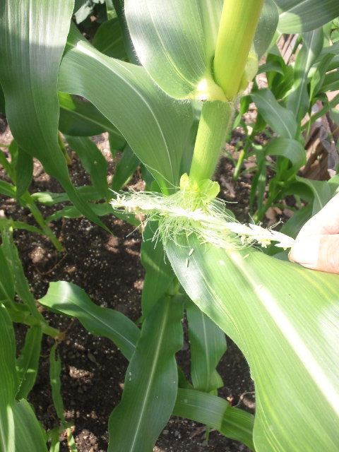 トウモロコシは自家受粉しないので、隣の花粉が必要です。