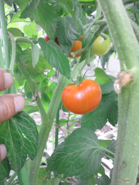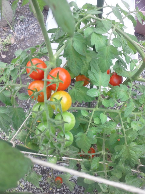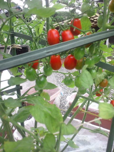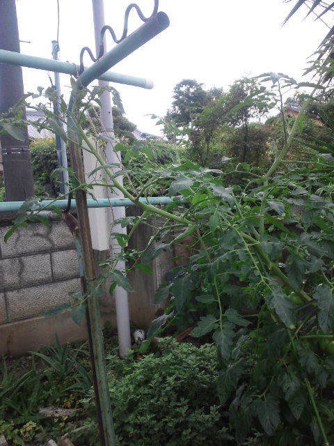 物干し竿に、はみ出たトマトを誘引しましたV(^-^)V