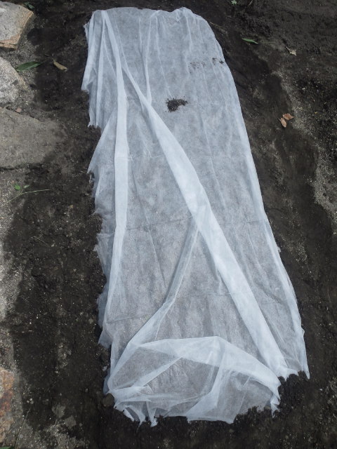 ニンジンの種を蒔き終わったら、畝全体を不織布で覆います。