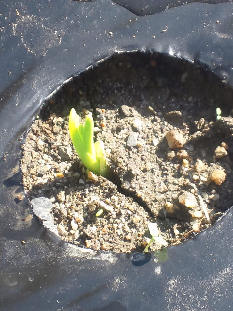 ニンニクも芽を出す時には、ボコって感じで出てくるんですね。