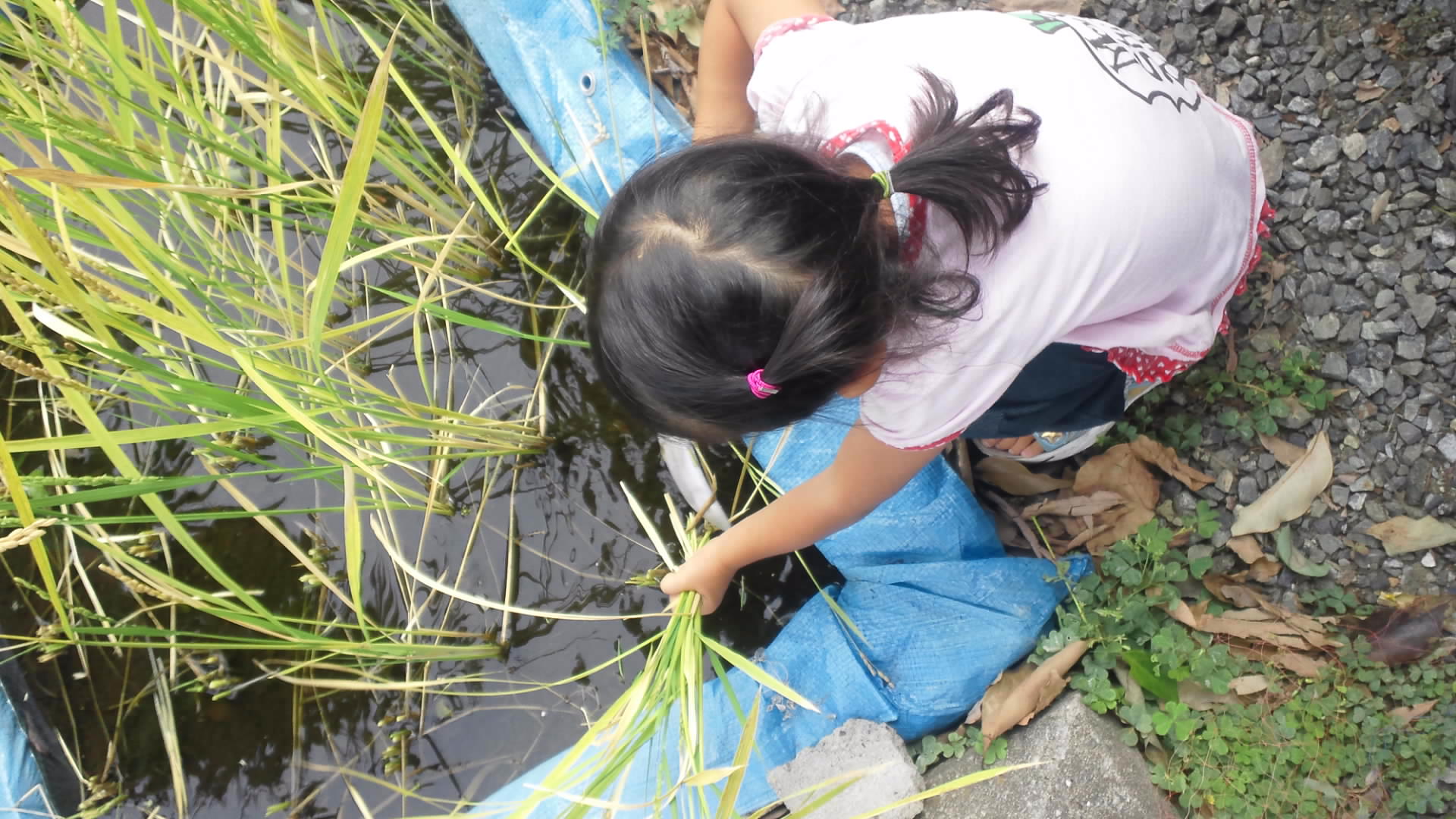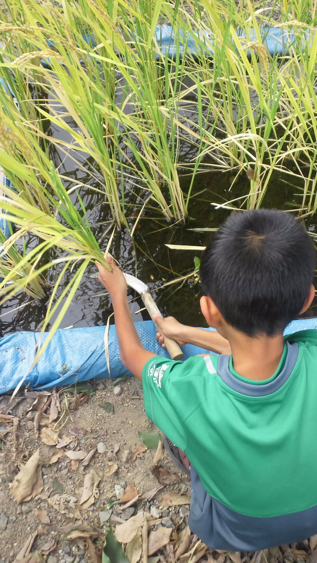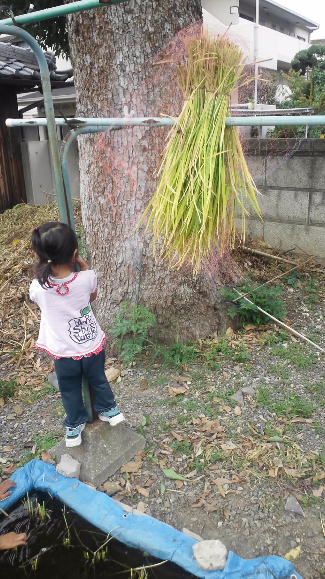 本来なら落水(水抜き)してから稲刈りするのですが、今回はメダカの数が多いのでそのまま稲刈りです。