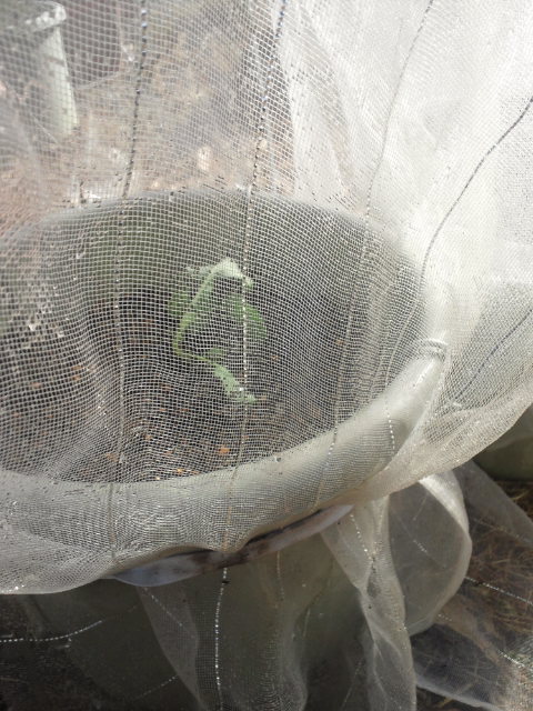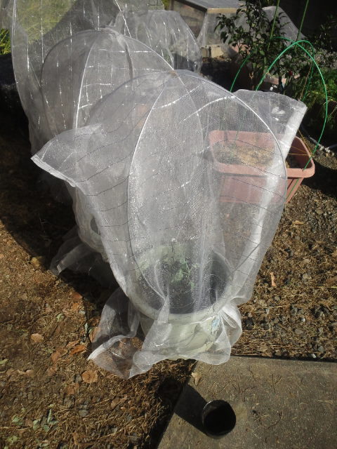 プランターより広い範囲に支柱を作る事で、葉がネットに触れる事を防げる予定…
