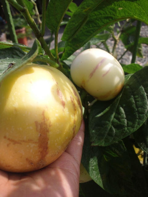 一番初めに結実したペピーノの実が黄色くなってます。