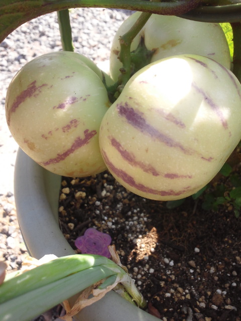 ペピーノの実の表面の黒い筋が濃くなって、緑色の部分が黄色く色付くと食べ頃らしい。