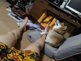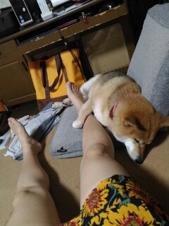 寝ている柴犬さくらの側に、ママが足を伸ばしました。