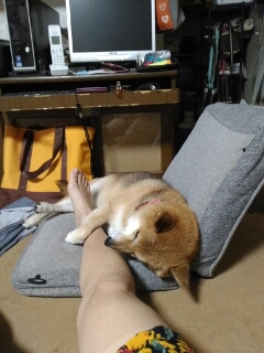 ママの足が、丁度良い太さと柔らかさなんだワンの柴犬さくらに、