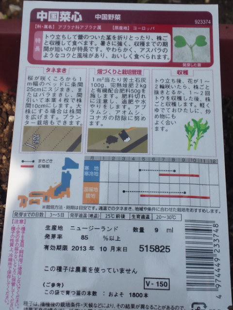 「中国菜心」の種は、沢山余ってるから、適当に空いた場所にまいといてみようかな。