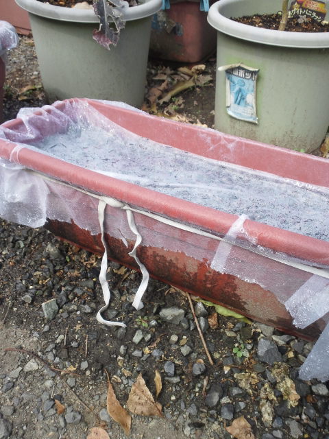 不織布をプランターに固定するのは、100均の洋服に使うゴムで巻いてます。