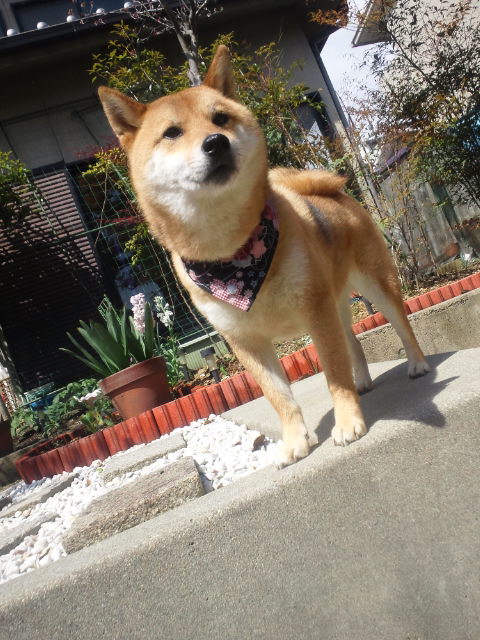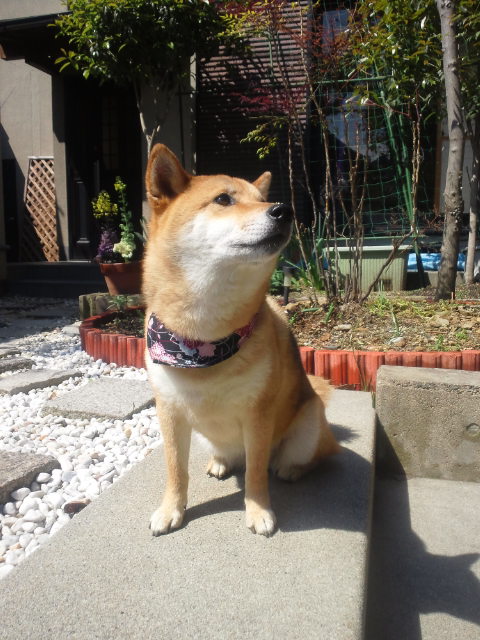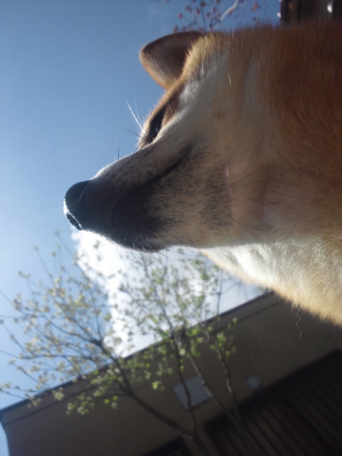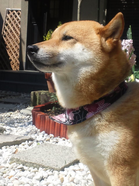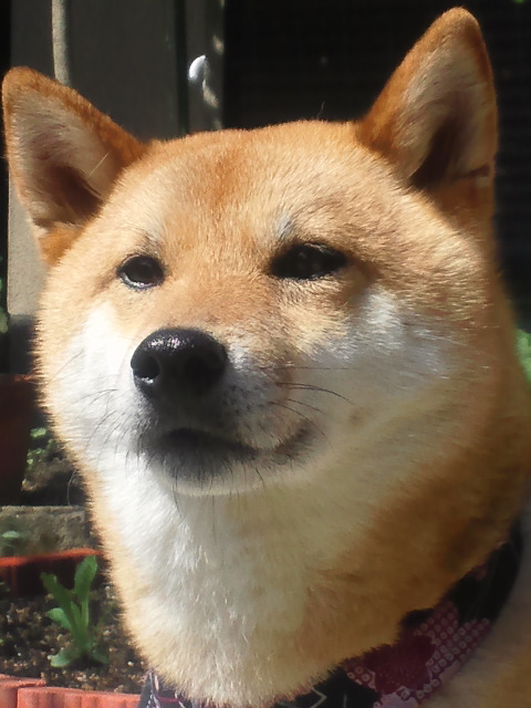 かなり、とぼけた顔して、光合成中の柴犬さくら。