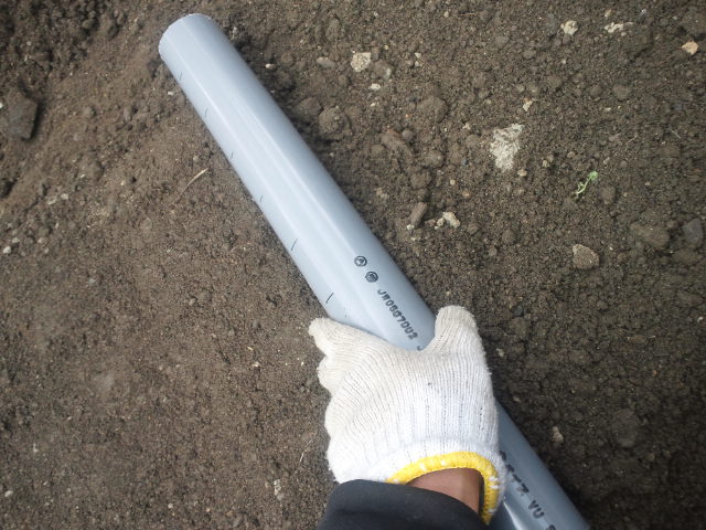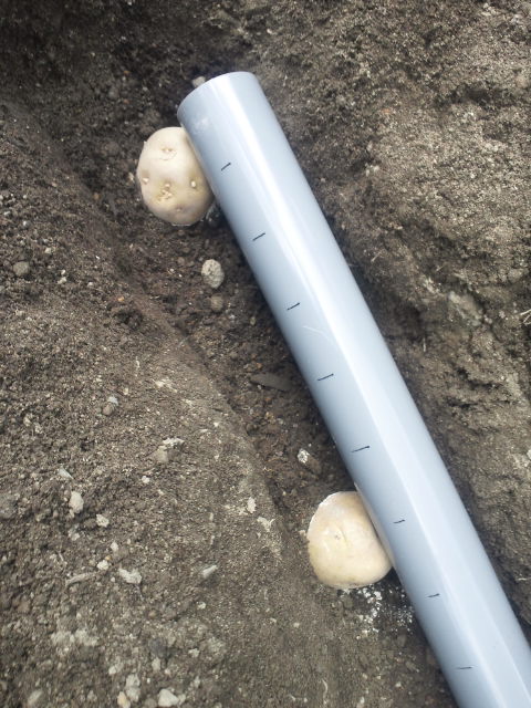 そして、植え付け用に掘った溝に、新兵器を使って、30cm間隔で並べます。